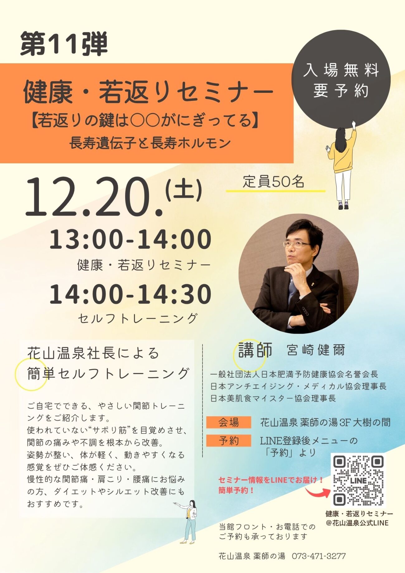 次回、健康・若返りセミナーは12月20日(土) テーマは、【長寿遺伝子と長寿ホルモン】 です。 ご予約はこちらよりお願いします。たくさんの方のご参加お待ちしております!