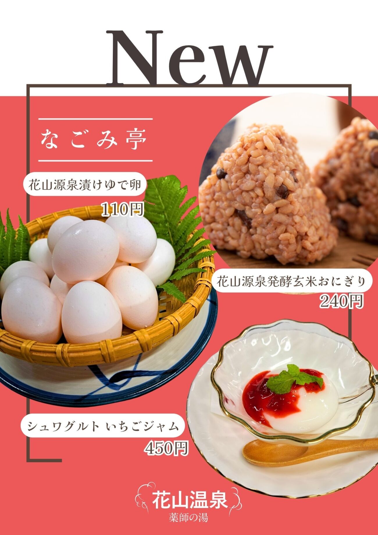 花山源泉漬けゆで卵や花山源泉発酵玄米おにぎり等、体がよろこぶ新メニュー登場! デザートにはお米を発酵させて作ったシュワグルトをどうぞ!