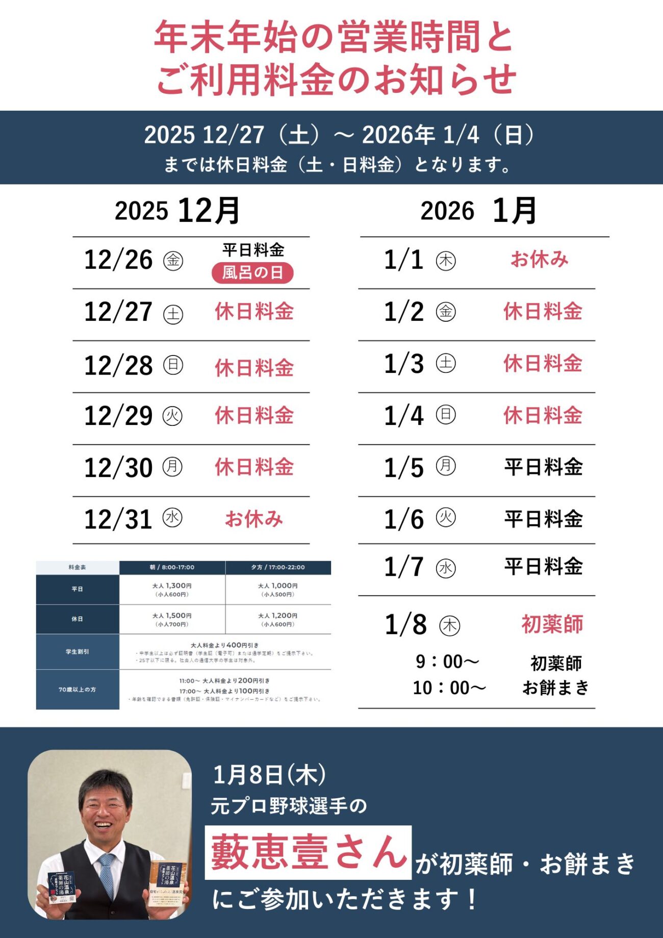 12月27日~1月4日までは休日料金となります。