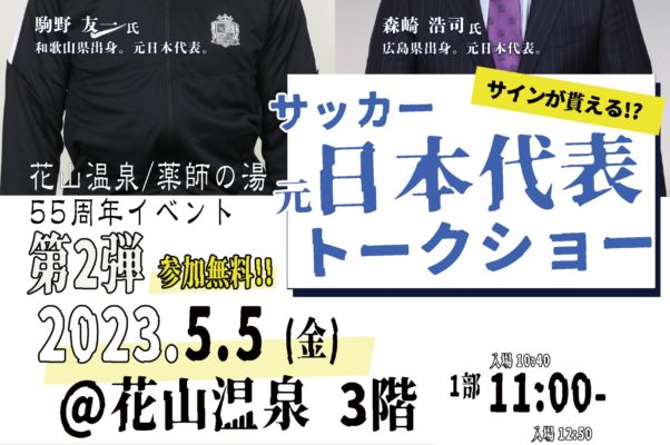 【55周年イベント第二弾】 花山温泉は皆様のおかげ様で55周年を迎えることができました。 つきましては55周年イベント 第二弾を開催いたします。 元サッカー日本代表選手によるトークショー、ライブパフォーマンスなどを楽しめ … 続きを読む 55周年イベント第二弾